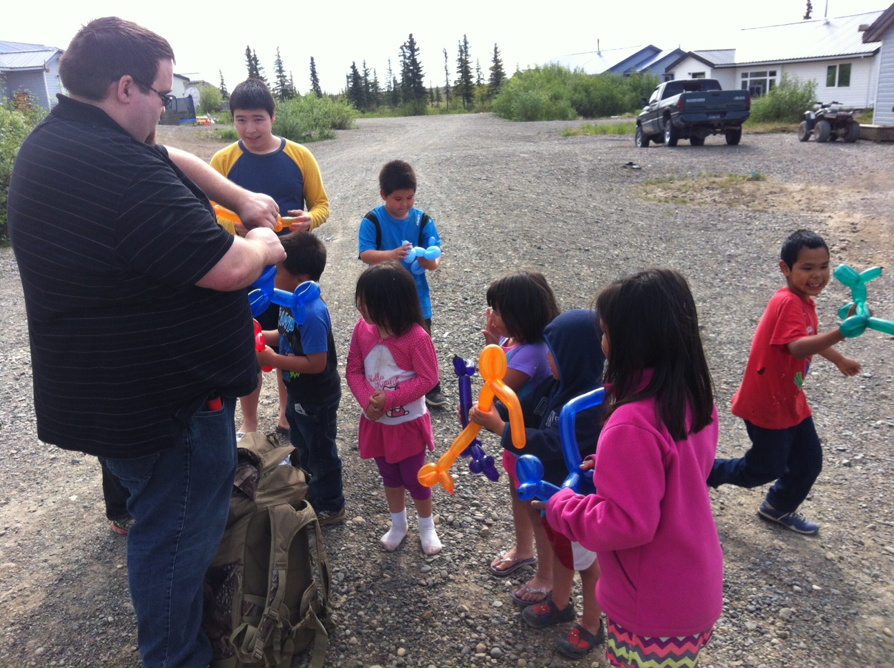 Missionary Phil Hulett making balloons for the kids as we passed out Bibles in Koliganek